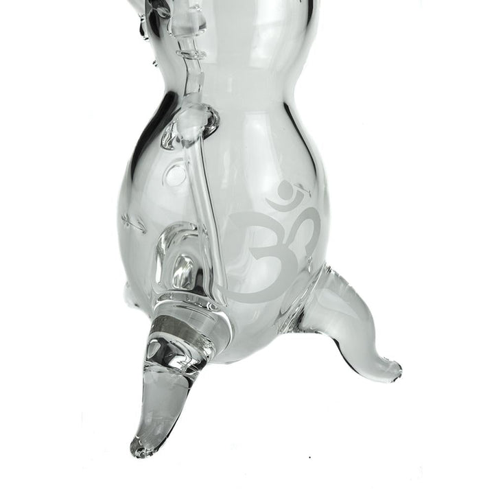 The clear Hurricane DTI 750 Symbol - The smoothest rip you'll ever take! That is how our testers described the Hurricane bongs from RoB with their patented cyclone technology when they got their hands on them. No more irritation when you take a massive pull of some super dank chronic, no more dirty ashtray taste, just clean smooth clouds that will leave you wanting another hit straight away. This is a world class bong, have no doubt. The Clear Symbol version is made of clear glass but has additional artwork on it, in this case, their OM symbol. The way the system works is that the smoke is firstly pulled up into and through each of the orb shaped chambers which gives it a chance to cool gradually as it rises. The smoke is then acted on by 6 Hurricane Jet Nozzles (two in each of the three chambers) which act to spin the air inside each of the chambers. This causes even the smallest of water droplets to clump together and get forced onto the glass by the centrifugal force and leaves only the cleanest and purest smoke to continue it's journey upwards. In addition to all of that they also include a dry ashcatcher which attaches to the top of your downstem and allows you to stop a large percentage of the particles before they even get to the bong itself. There are several other key features which seperate the Hurricanes from the vast majority of bongs and they all simply come down to thinking about the way we use them and then trying to make it simpler. Firstly the carb hole is right on the front of the bong, meaning that you can use it while reclining and there is never going to be any spillage. Then there are three sturdy glass feet which mean it is going to always stand straight and true. They have even thought about making it easier for people with lip piercings by making the mouthpiece a shape which allows the piercing to no interfere with the seal around the edge. These hand made German masterpieces are made of the finest 100% borosilicate Schott Duran glass and come with 35 years worth of experience moulded into each one. Each Hurricane DTI 750 comes complete with two downstems (one for use with the ashcatcher and one for use without) along with a bowl to complete the set and a numbered authenticity card. The 750 version of the Hurricane is an absolute beast. It is capable of stacking a crazy 750ml of smoke ready for you to take a massive hit as you release the carb hole and clear it like a madman.