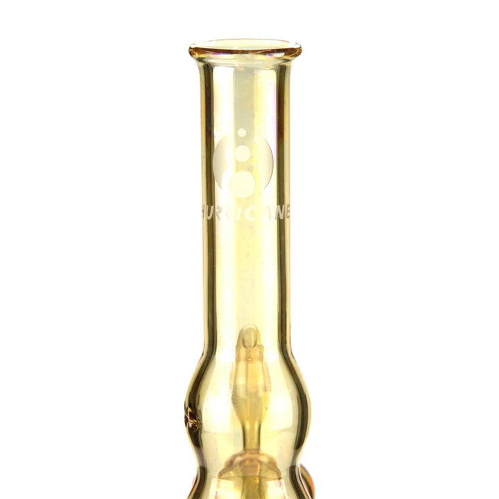The gold Hurricane TDE 600 TT Symbol - The smoothest rip you'll ever take! That is how our testers described the Hurricane bongs from RoB with their patented cyclone technology when they got their hands on them. No more irritation when you take a massive pull of some super dank chronic, no more dirty ashtray taste, just clean smooth clouds that will leave you wanting another hit straight away. This is a world class bong, have no doubt. The Symbol version features additional artwork over the normal ones, in this case their Fire Water logo. The way the system works is that the smoke is firstly pulled up into and through each of the orb shaped chambers which gives it a chance to cool gradually as it rises. The smoke is then acted on by 3 Hurricane Jet Nozzles (one in each of the three chambers) which act to spin the air inside each of the chambers. This causes even the smallest of water droplets to clump together and get forced onto the glass by the centrifugal force and leaves only the cleanest and purest smoke to continue it's journey upwards. In addition to all of that they also include a dry ashcatcher which attaches to the top of your downstem and allows you to stop a large percentage of the particles before they even get to the bong itself. There are several other key features which seperate the Hurricanes from the vast majority of bongs and they all simply come down to thinking about the way we use them and then trying to make it simpler. Firstly the carb hole is right on the front of the bong, meaning that you can use it while reclining and there is never going to be any spillage. Then there are three sturdy glass feet which mean it is going to always stand straight and true. They have even thought about making it easier for people with lip piercings by making the mouthpiece a shape which allows the piercing to no interfere with the seal around the edge. These hand made German masterpieces are made of the finest 100% borosilicate Schott Duran glass and come with 35 years worth of experience moulded into each one. Each Hurricane TDE 600 TT comes complete with two downstems (one for use with the ashcatcher and one for use without) along with a bowl to complete the set and a numbered authenticity card. The 600 versions give an impressive volume. Allowing 600ml of smoke to be stacked in one go they offer a massive hit compared to your everyday bong.