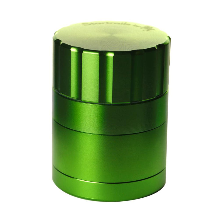 Black Leaf are one of Europe's most respected and popular glass water pipe manufacturers who always make sure they offer stuff at amazing prices and now they have ventured out into the grinder game. This Startrails grinder is a 4-part design that uses blade shaped cutting teeth to cleanly slice even the dankest and stickiest material. The result is perfectly ground material that comes out the right consistancy every single time without any squashing or crushing of the precious resin sacks on your herbs. Once ground, the herbs can fall through precisely drilled holes into the collection chamber below. The two halves of the grinding section are held together by two incredibly strong rare earth magnets which mean it takes genuine effort to get the two halves apart and pretty much guarantees they won't come apart unless you want them to. The sifter screen built into the bottom of the collector area allows any loose resin sacks to fall through into the bottom section of the grinder and stay there, nice and safe, until you want to open it up and scrape it all out with the supplied scraper so that you can put it to good use. Unlike normal grinders that have threaded joins between the bottom three parts, this uses a bayonet-style fitting to ensure a perfect lock but mean it only needs a quick quarter turn twist to unlock it and open it up. We absolutely love all the features this reasonably priced grinder offers which are normally only found on much higher priced grinders, it is the definition of a bargain!